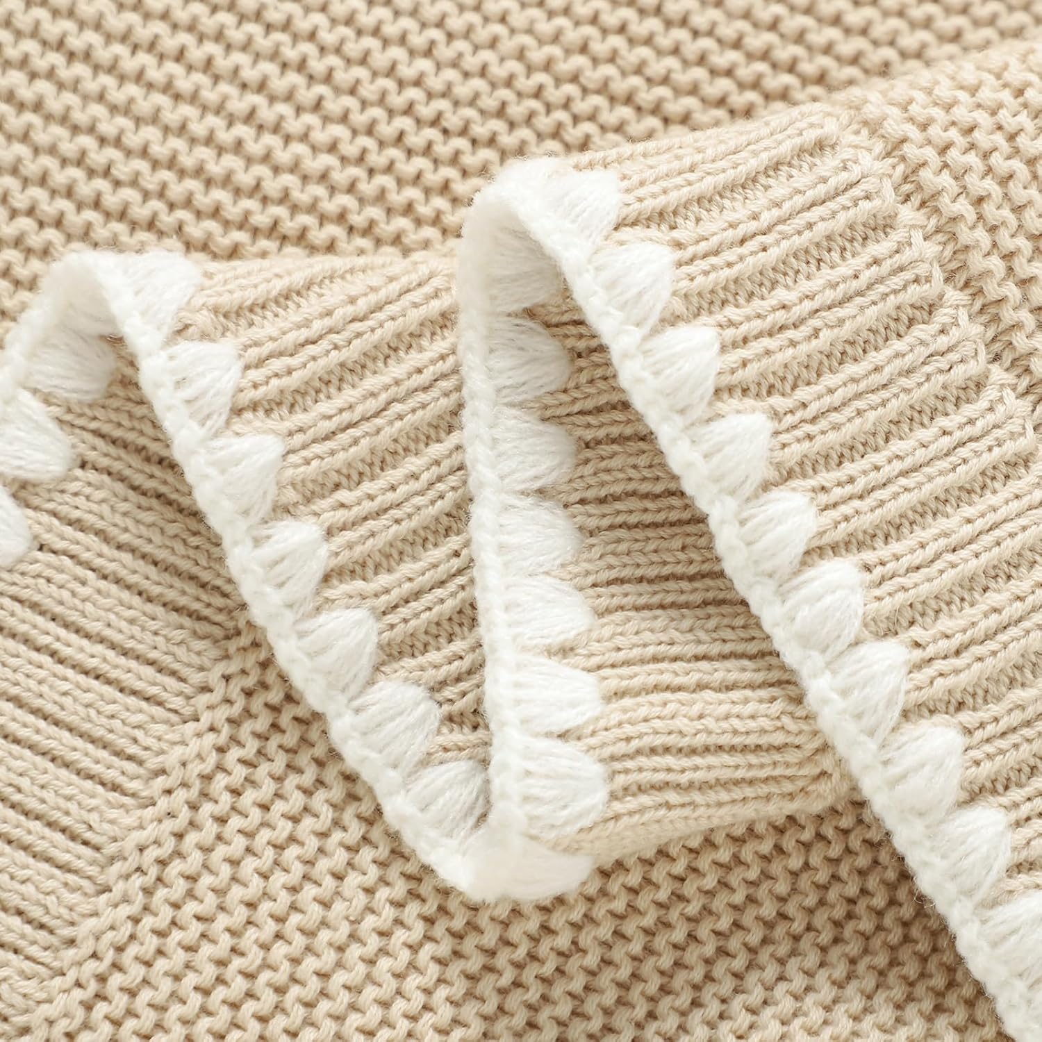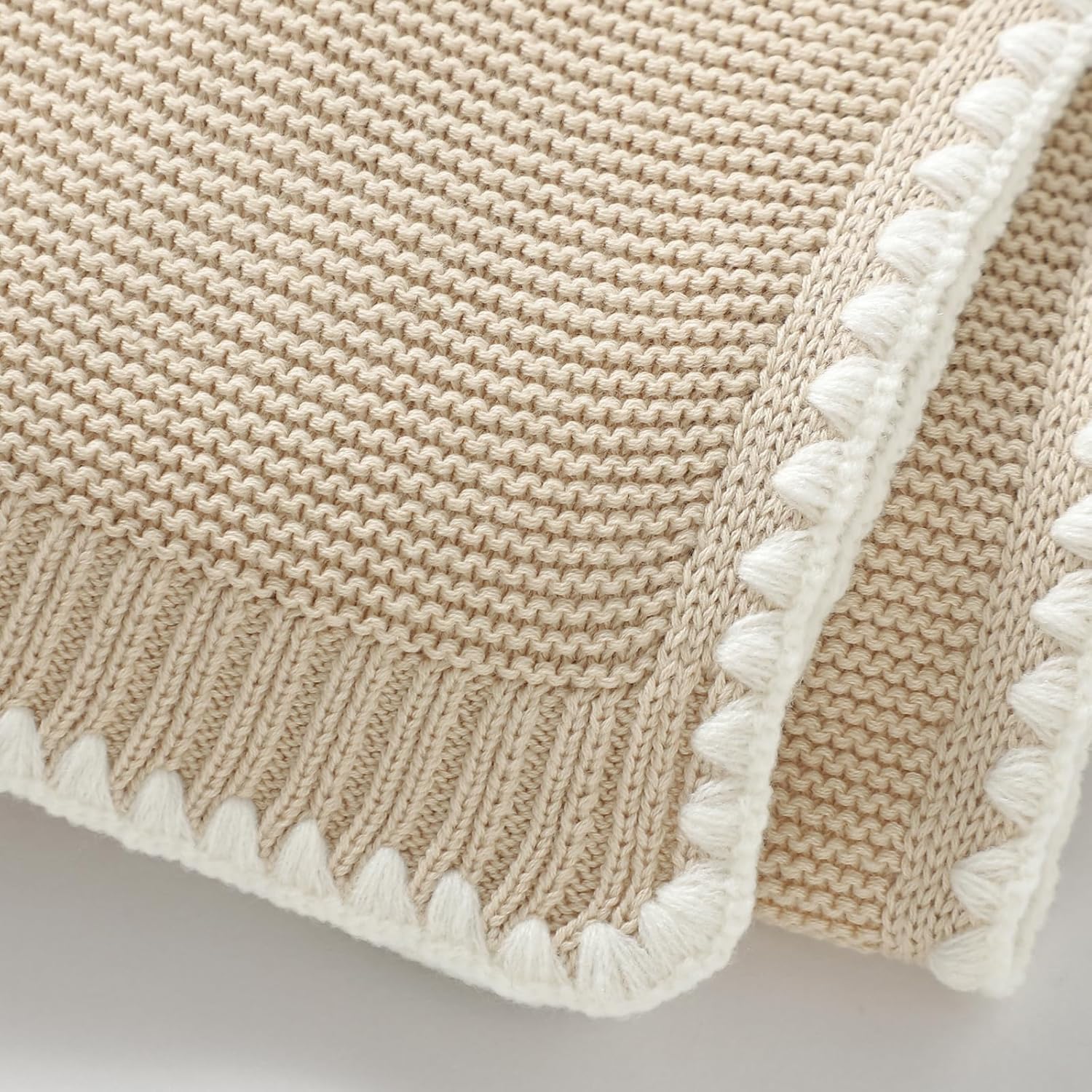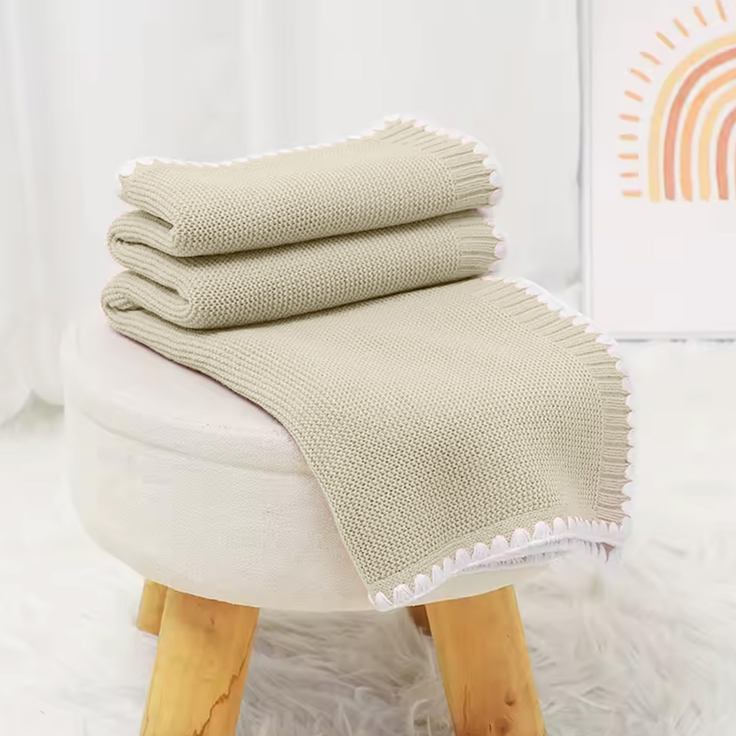 Combining timeless elegance with modern durability, our contrast stitch knitted blankets are a standout addition to any nursery collection. Crafted from 100% long-staple cotton using a high-density moss stitch, this blanket provides a sophisticated texture and a comforting weight. The exquisite white scalloped edge finish offers a clean, handcrafted look, making it a favorite for boutique retailers and premium gift brands.