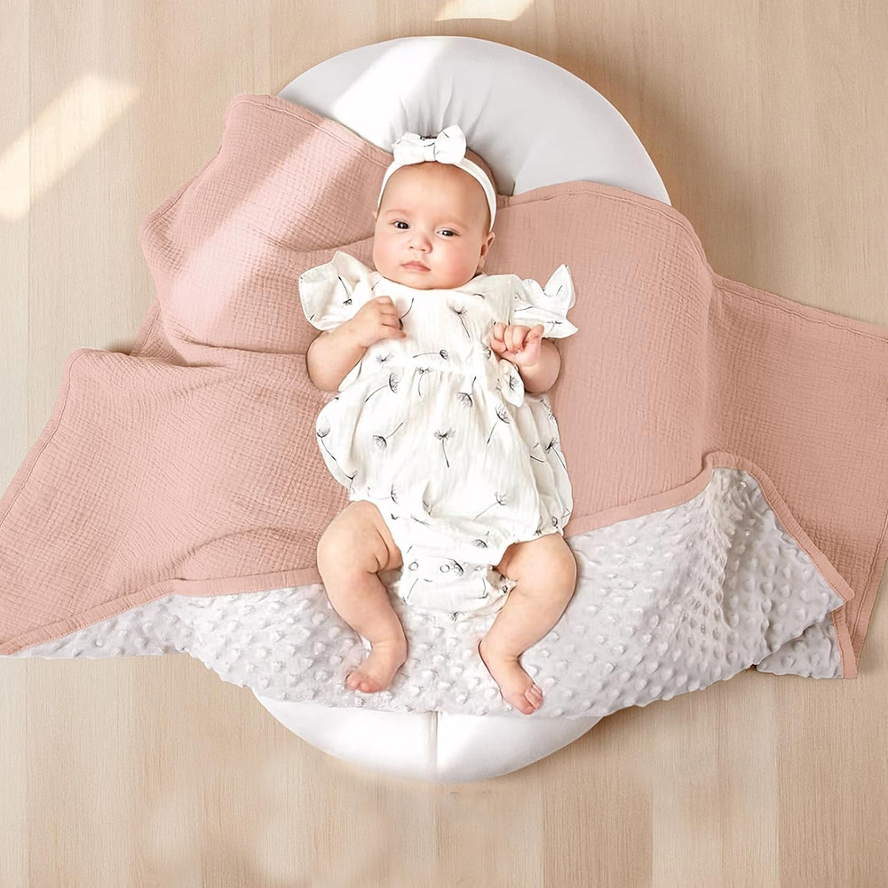 Combining the breathability of natural cotton with the soothing comfort of our signature 3D dots, this dual-texture blanket is engineered for year-round versatility. The pre-washed muslin side offers a lightweight, airy feel, while the minky underside provides the tactile security infants crave.