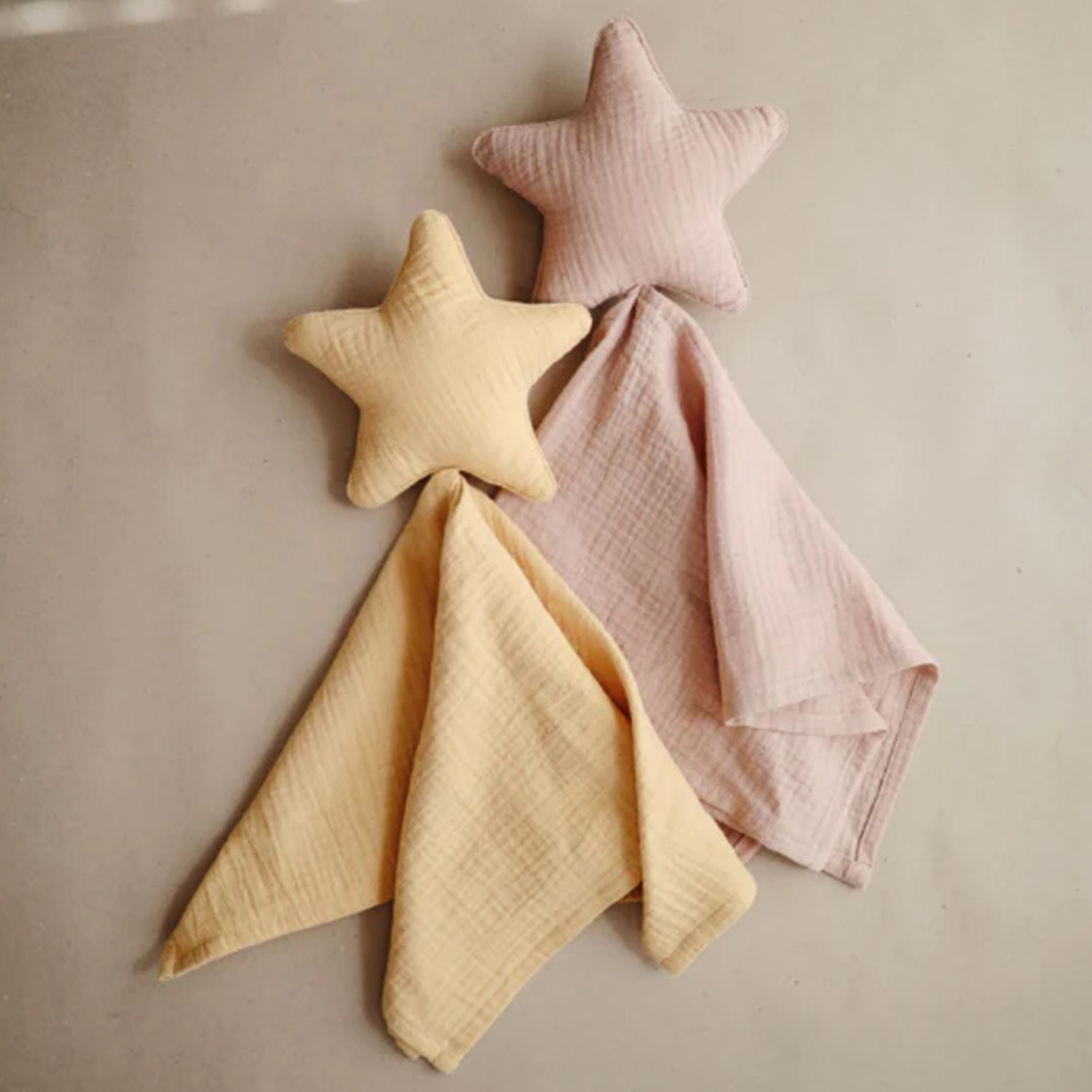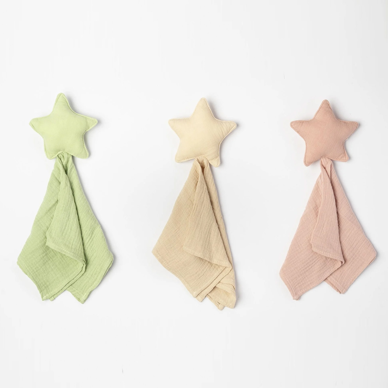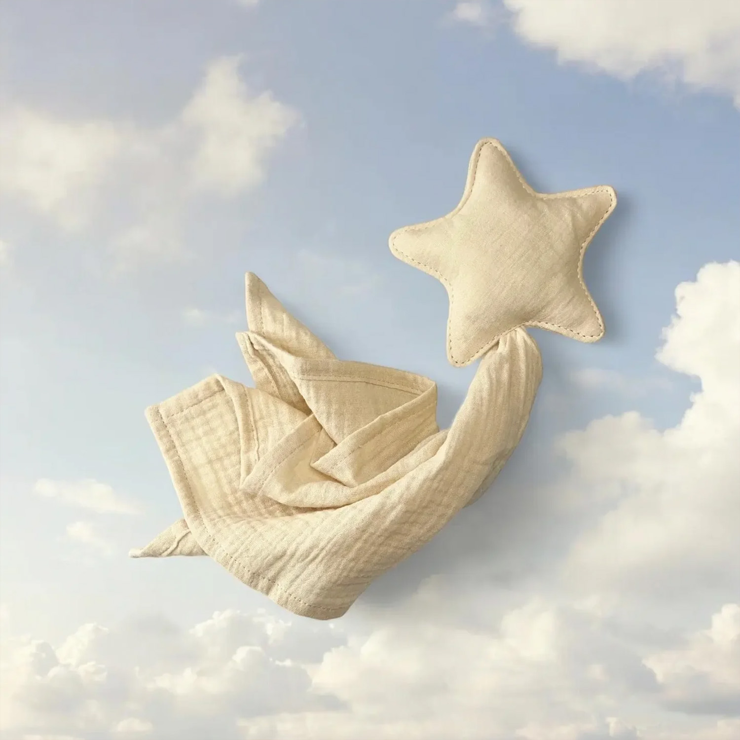 Designed for the modern, eco-conscious nursery, our star muslin comforter combines high-breathability with a minimalist aesthetic. Crafted from premium double-layered cotton gauze (Muslin), this soothing towel offers a unique crinkle texture that becomes softer with every wash. The integrated padded star head provides a soft point for infants to grasp, while the lightweight muslin body absorbs familiar scents to help calm and comfort newborns during sleep.
