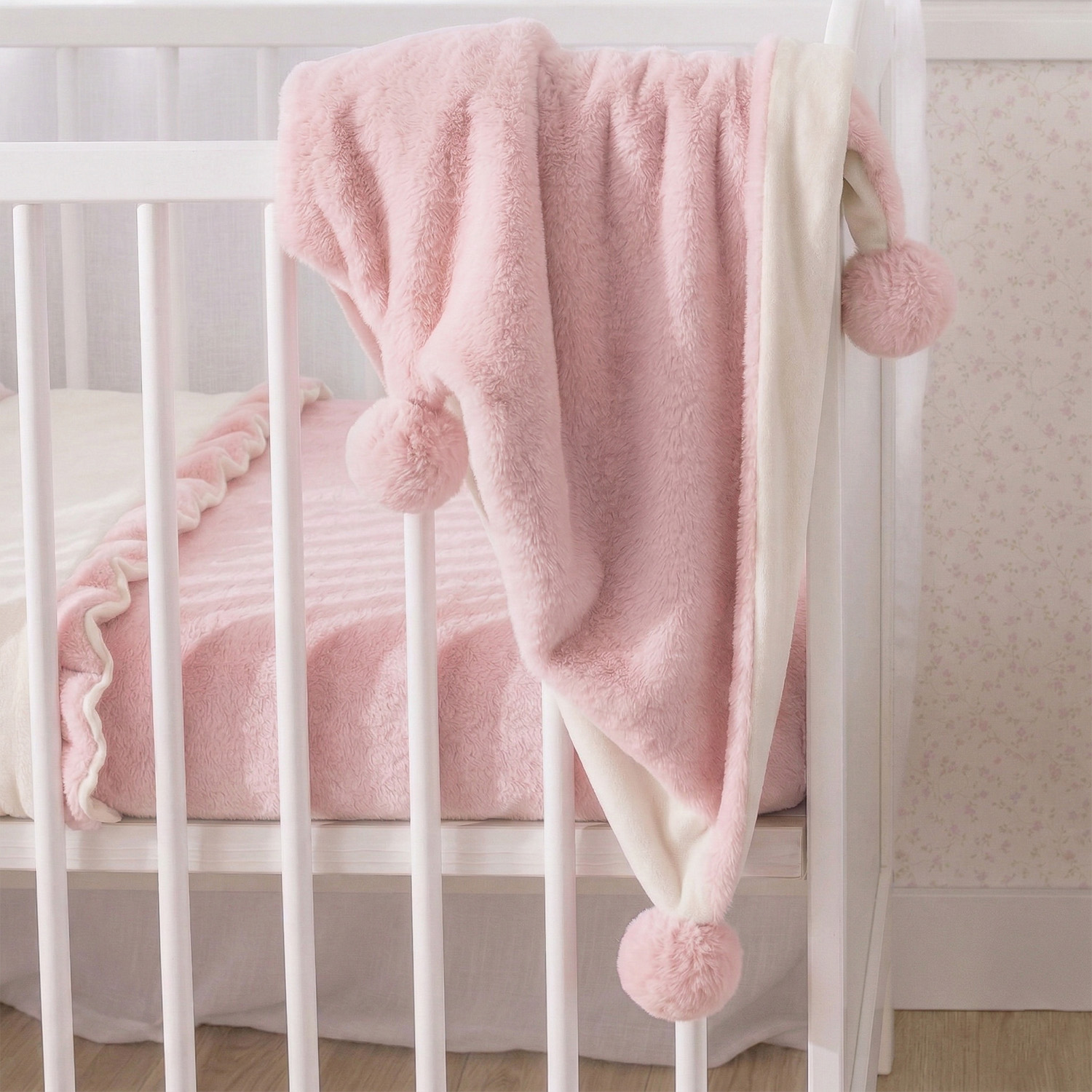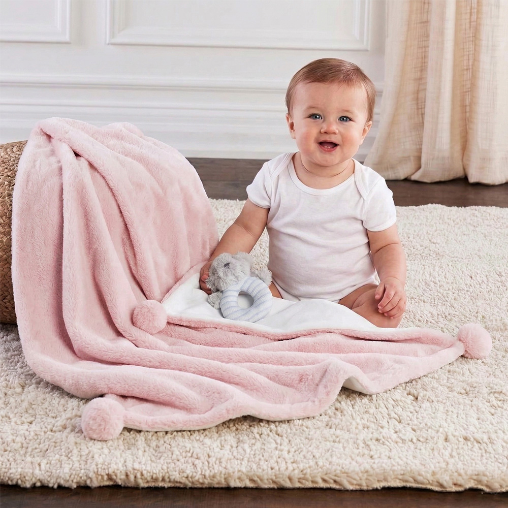 Designed for ultimate warmth and a touch of playful elegance, our double-layer pom-pom blankets are a bestseller for premium nursery brands. This blanket combines a silky-soft flannel fleece face with a cozy, high-pile Sherpa reverse, providing dual-layered insulation for colder months. The artisanal pom-pom accents at each corner add a whimsical, boutique feel, making it an ideal choice for milestone photography and high-end gifting.