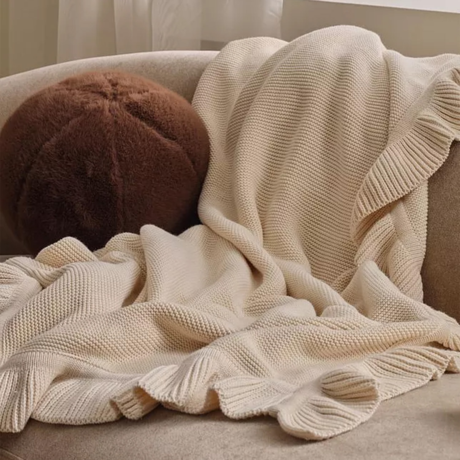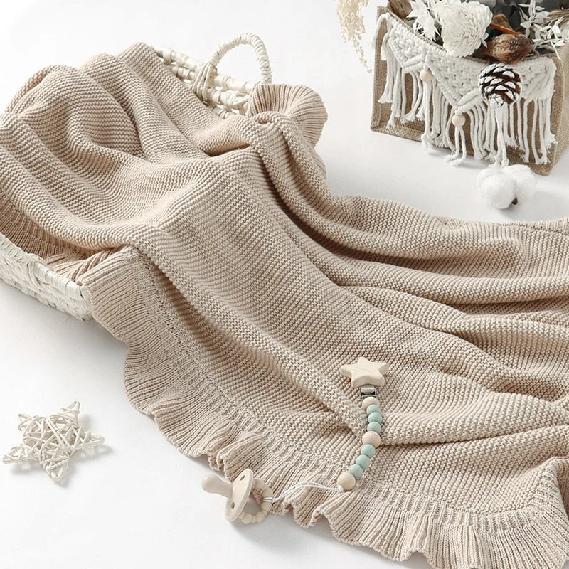 Exquisitely crafted with a vintage-inspired aesthetic, our ruffle knitted blankets offer a sophisticated touch to any nursery. Made from 100% long-staple cotton, these blankets feature a soft, breathable knit structure and an elegant ruffled border. The medium-weight density provides comforting pressure that helps infants feel secure, making it an ideal choice for high-end boutique brands and gift retailers.